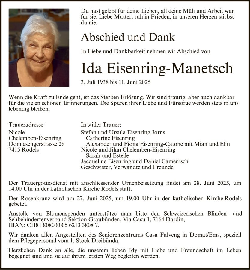 wir entbieten Euch unser herzliche Beileid zum Tod Euerer Mutter. Anfang der 90-er Jahren zogen wir von Niederhasli wieder ins Bündnerland, nach Rodels. Da haben wir Eure Eltern kennen gelernt. Damals war es für unsere beiden Buben das grösste, mit dem Postauto nach Hause zu kommen, bei der Post aussteigen, mit den Eisenrings noch ein wenig zu plaudere. Jedes Mal wenn’s zum einzahlen zur Post ging, gab’s jedes Mal Gummibärli für die Kinder. Wir denken sehr gerne an unsre Zeit in Rodels zurück, Eure Eltern hatten für jeden ein freundliches Wort. Nun dürfen sie wieder vereint sein, und wachen von oben über Euch.